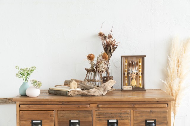 壁掛けもできる横18cm×奥行き9cm×高さ26cmのコンパクトタイプと横17.5cm×奥行き13cm×高さ33.5cmの豪華に飾れる縦長タイプの2サイズ展開。