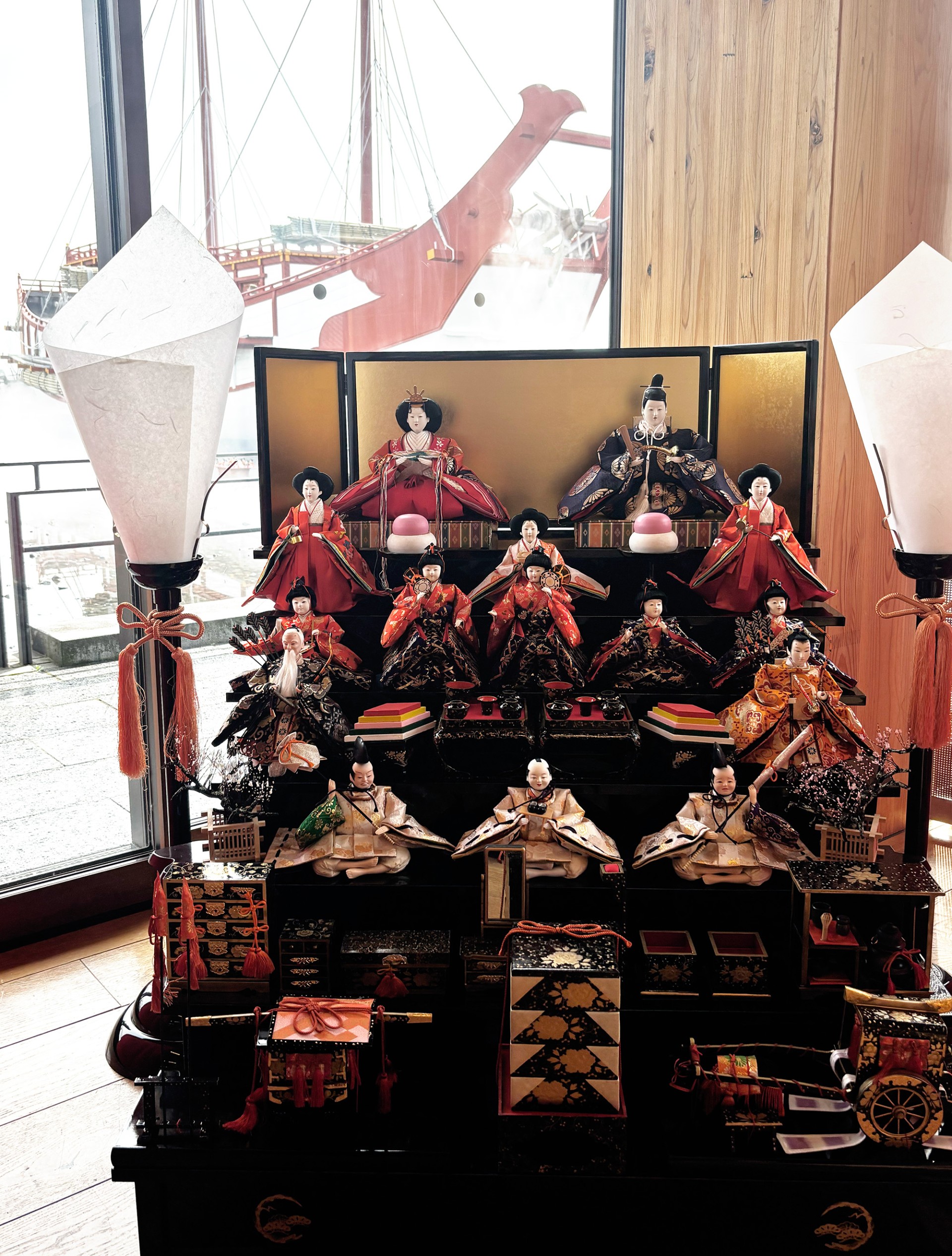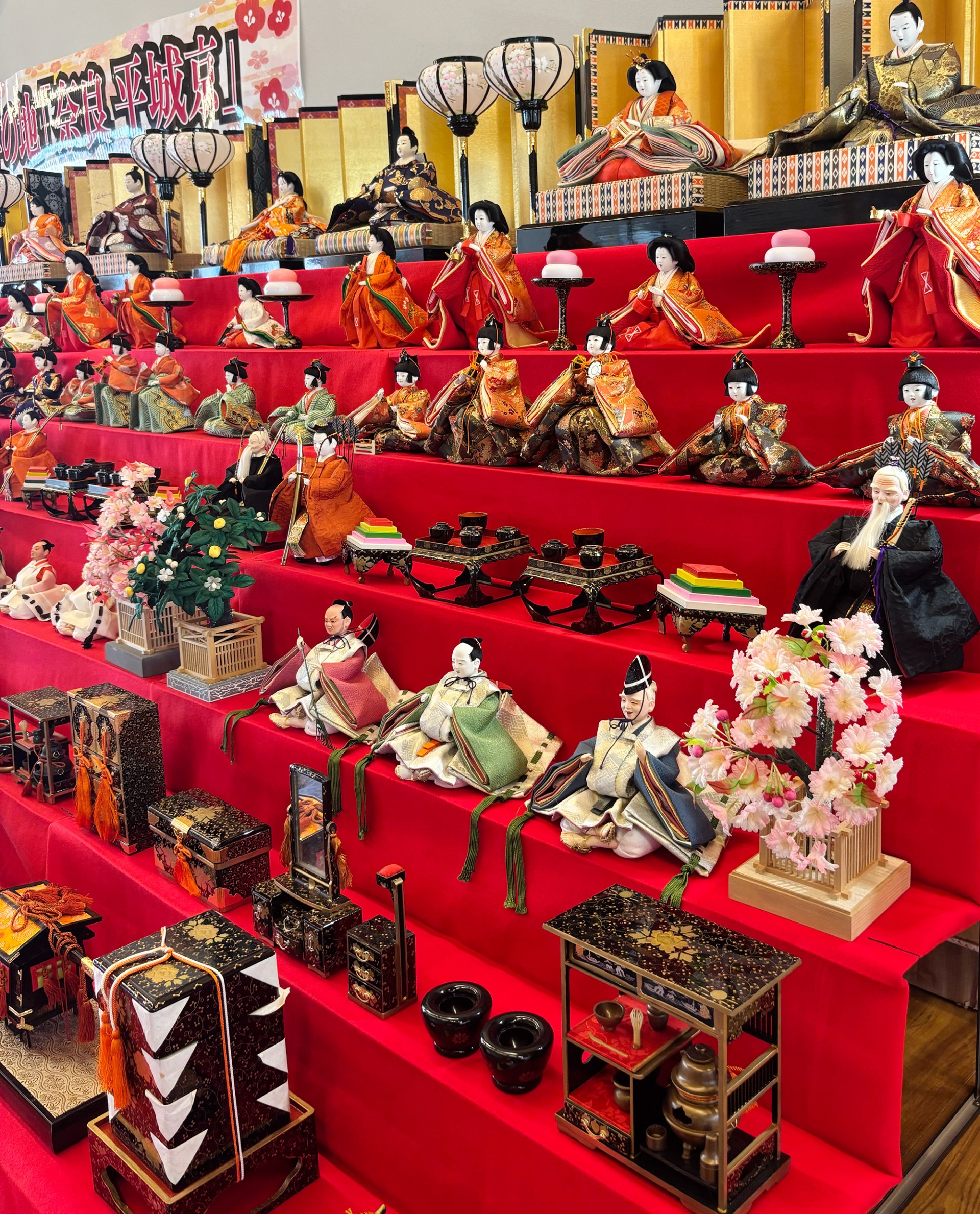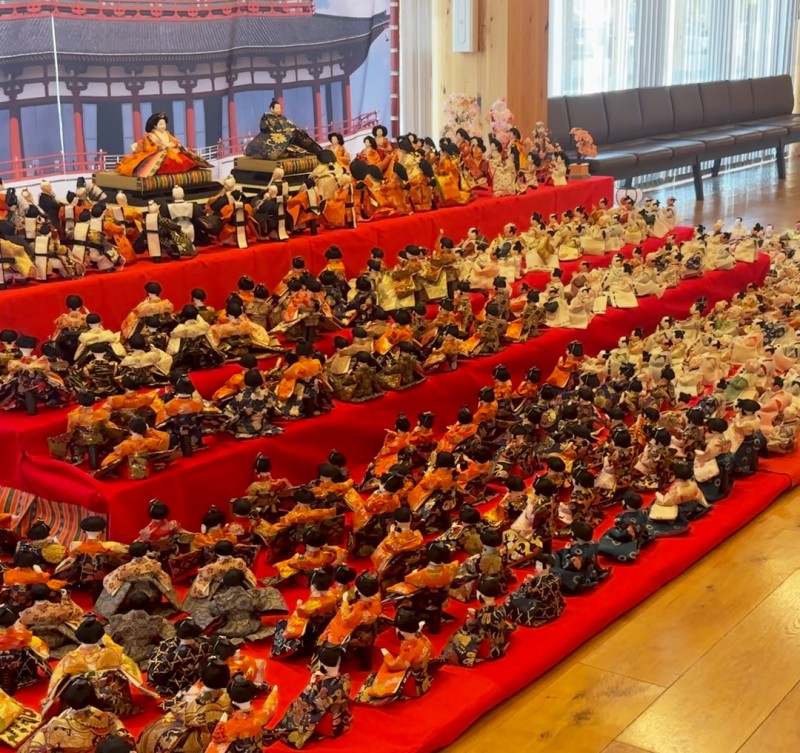 会場には約3,000体以上の雛人形が展示され、歴史ある都の跡地が春の節句の彩りに包まれています。