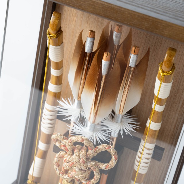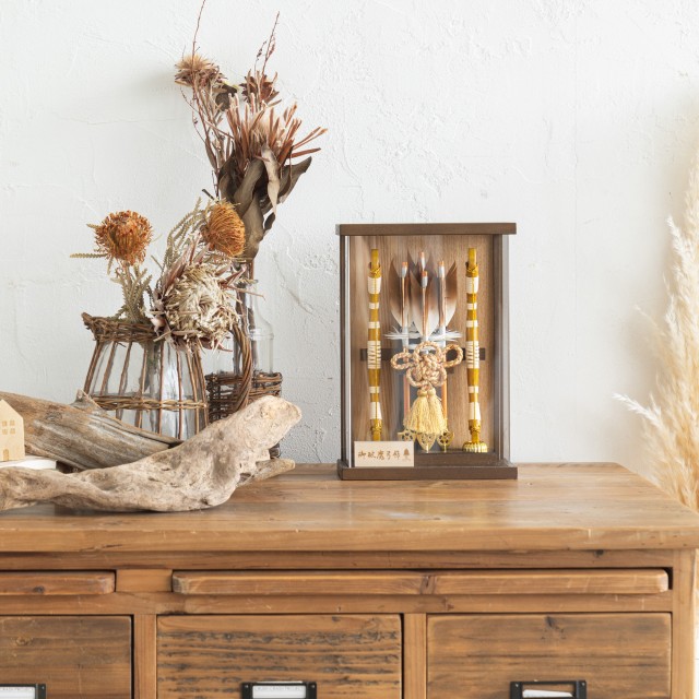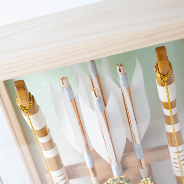 破魔弓は、魔よけ、厄払いのお守りです。男の子の元気な成長を願いお正月の縁起の祝い物となっています。古来からの行事であった新春の年占いや厄払いがその始まりです。男の子が弓矢で的を射て年占いをしたのがのちに破魔弓となりました。